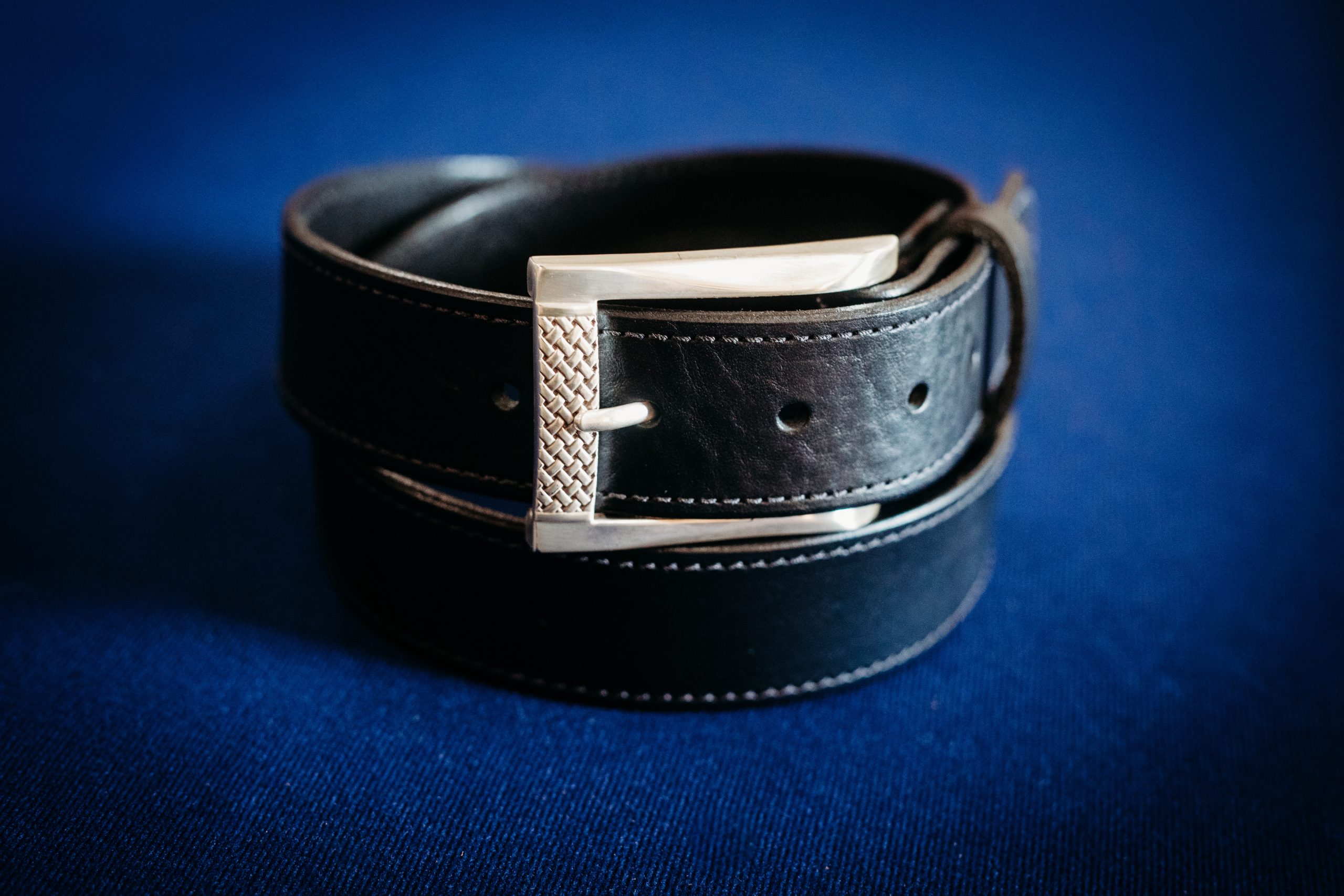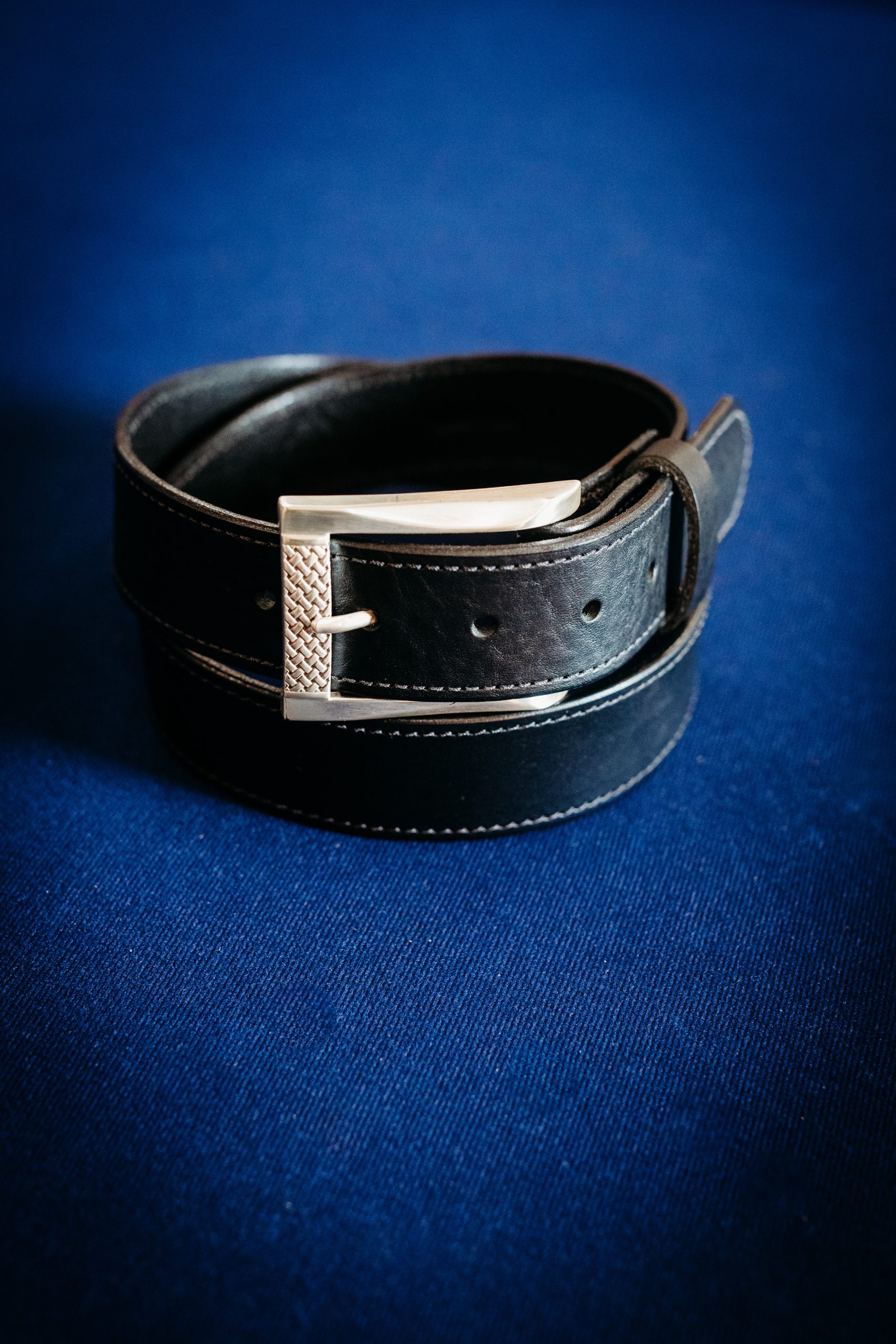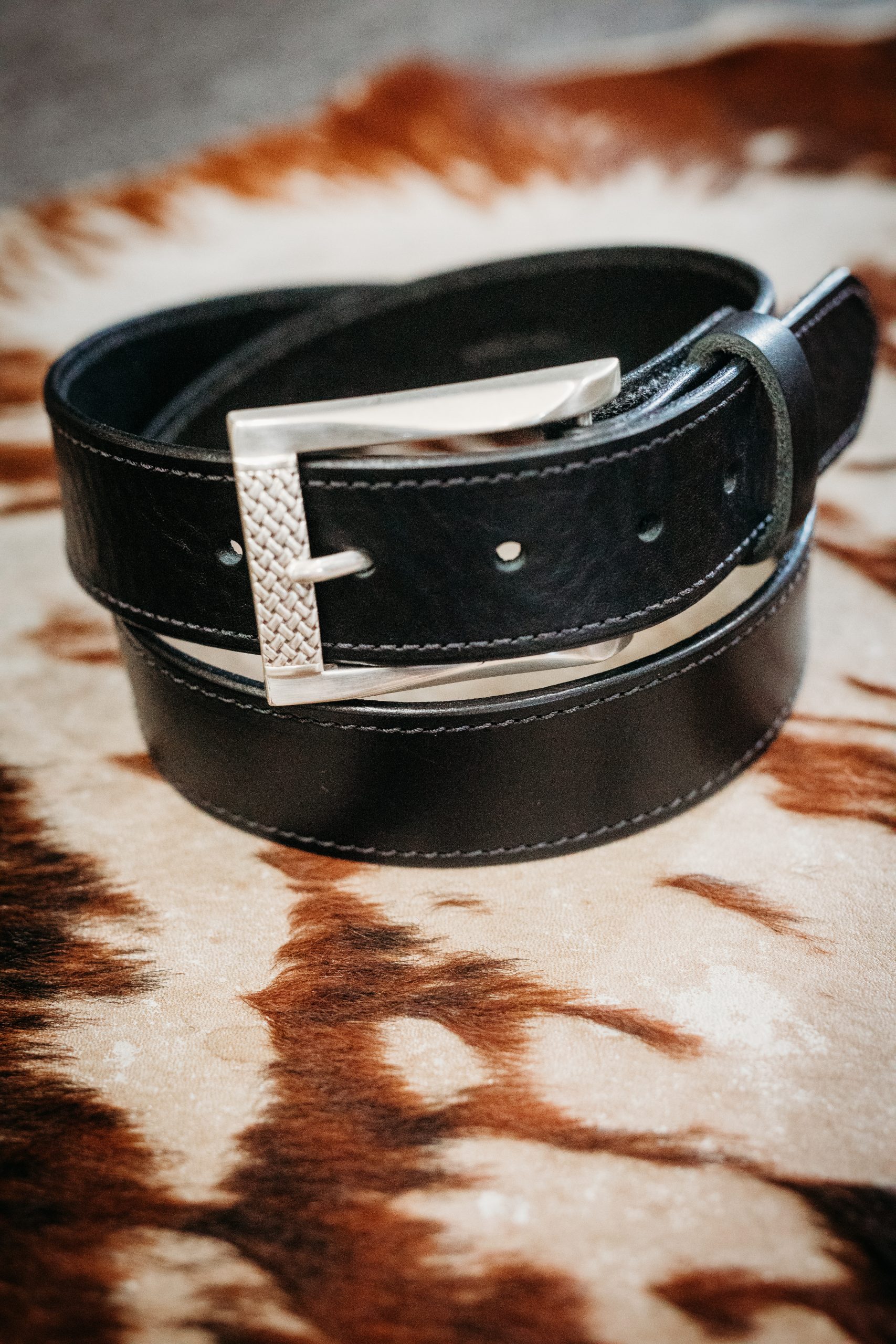 Crafted from 1½” black full-grain leather, this timeless belt pairs classic workmanship with refined detail. It features a polished silver buckle with a basket-weave textured accent, adding subtle depth and character, while black stitching finishes the look with clean, understated precision. Versatile and durable, this belt transitions effortlessly from everyday wear to more polished occasions.