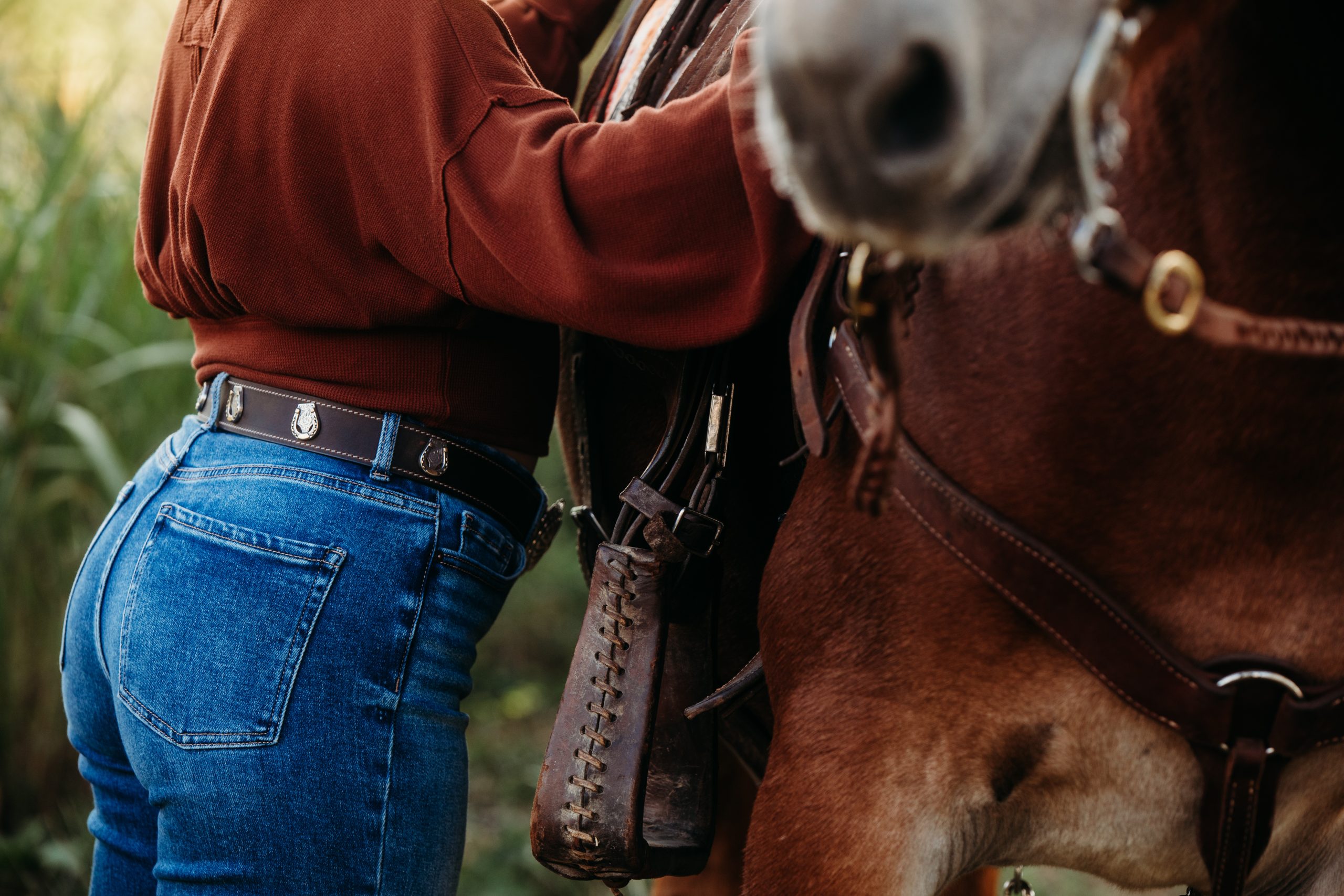 This ladies belt is a stunning, versatile statement piece that blends western charm with equestrian elegance. Its polished silver-tone oval buckle adds distinctive flair, while the genuine water buffalo leather delivers durability and rich character. Silver and brass horseshoe conchos along the back, paired with contrast stitching, create eye-catching detail—making this piece as much wearable art as it is an accessory.