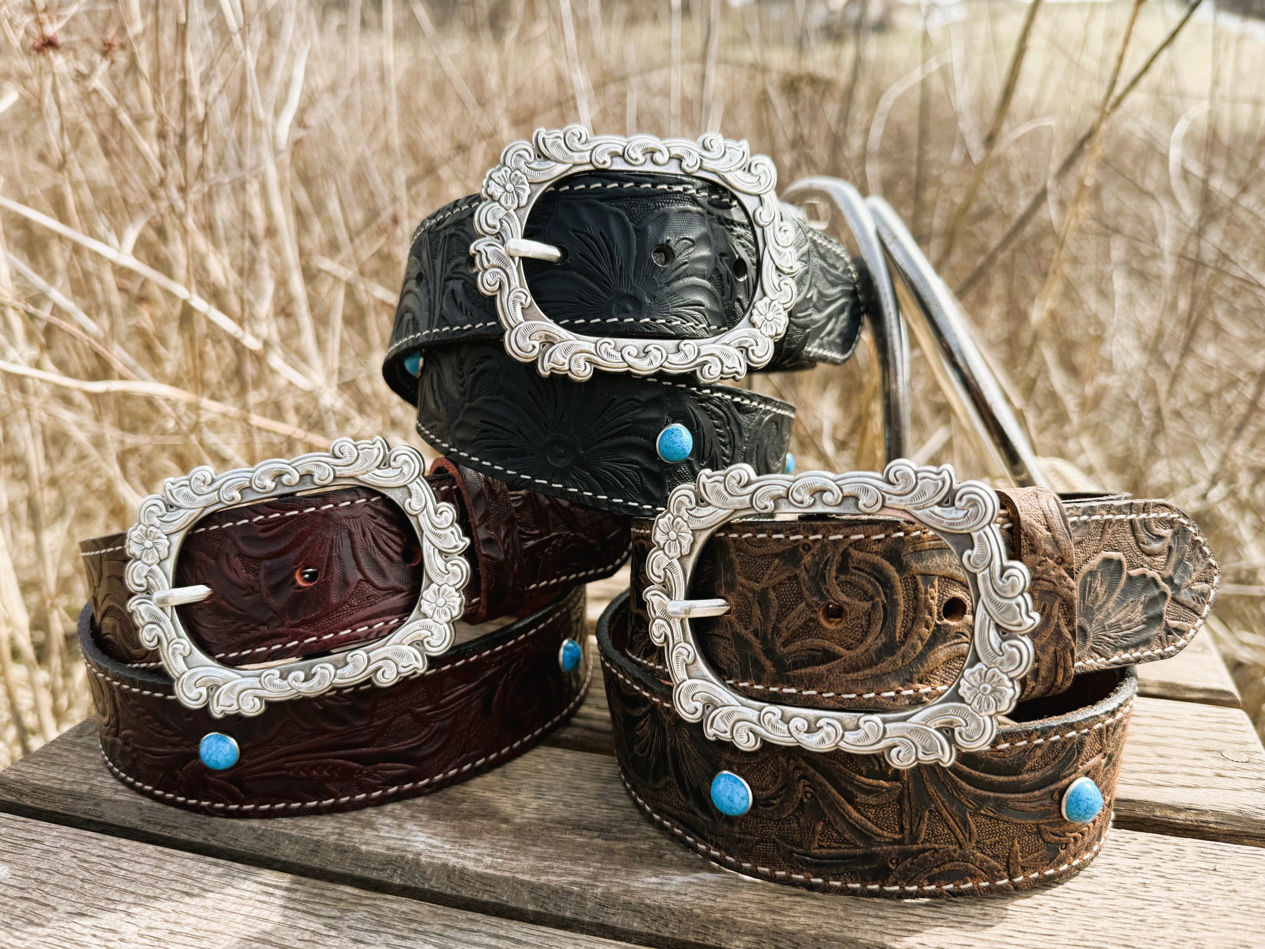 The standout feature is its elegant silver-tone buckle, designed with delicate floral intricacies that brings a refined touch to its rugged foundation. Accented with subtle turquoise spots, the Mae belt offers just the right pop of color, creating a look that’s both eye-catching and versatile.