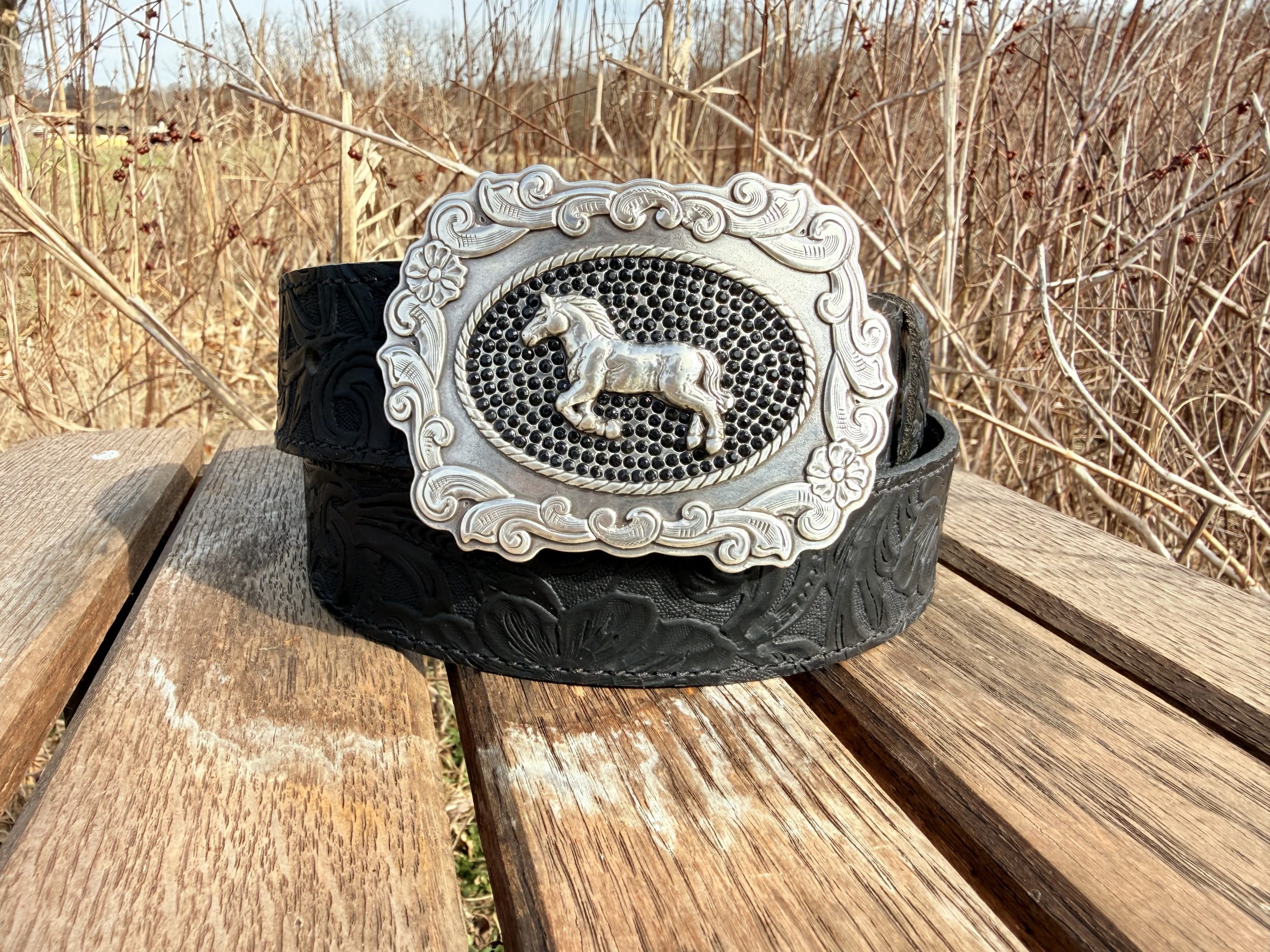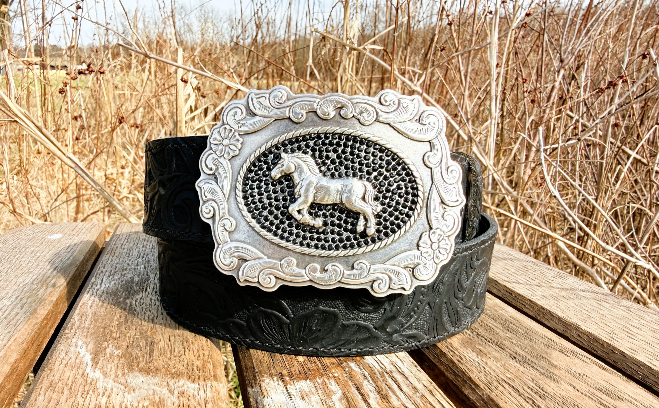 At the center, an eye-catching oval buckle showcases a raised horse figure set against a black crystal backdrop, framed by intricate silver-tone scrollwork. This unique combination brings a perfect balance of equestrian charm and elevated design.